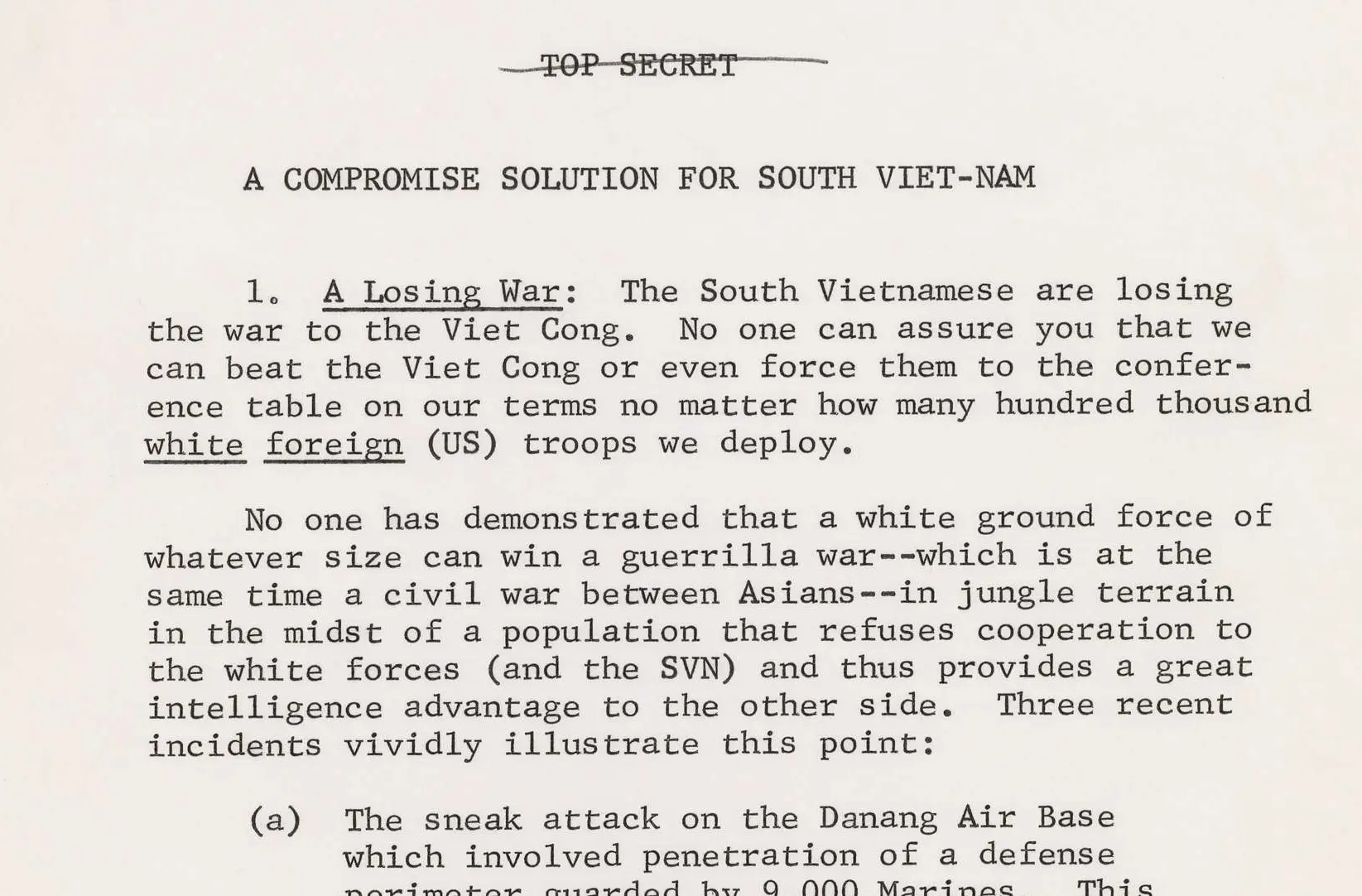He stated: “No one can assure you that we can beat the Viet Cong or even force them to the conference table on our terms, no matter how many hundred thousand white, foreign troops we deploy.”