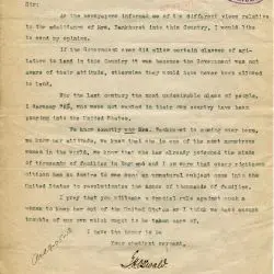 In this letter a citizen wrote to express the opinion that the suffragette, Mrs. Pankhurst, should not be admitted to the United States, calling her one of the most monstrous women in the world. It comes from an appeal of English suffragette Mrs. Emmeline Pankhurst for admittance. This document was digitized by teachers in our Primarily Teaching 2014 Summer Workshop in Washington, DC.