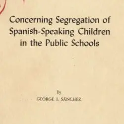 This item is the book “Concerning Segregation of Spanish-Speaking Children in the Public Schools” by George I. Sanchez found in Civil Action Case 1384, Herminio Hernandez, et. al. v. Driscoll Consolidated Independent School District, et. al. Several pages of this 39 page document are shown here. See the entire document in the National Archives online catalog.