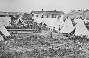 This photograph shows a “contraband” camp in Richmond, Virginia. During the early months of the Civil War in August of 1861, Congress passed, and President Lincoln signed, the First Confiscation Act. It stated that the Union could seize and confiscate property used in the Confederate war effort – including enslaved people. The Union Army set up camps to provide relief, including shelter, rations, clothing, medical attention, education, and even employment. The term ”contraband”— property confiscated in war—was given to enslaved people who escaped, or were freed as the Union Army advanced.