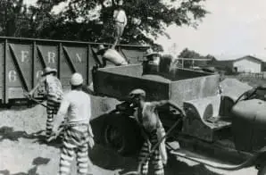 Full Citation: 30-N-35413; Convict Labor Loading Pea Gravel; 1929; Construction – Convict Labor; Historical Photograph Files, 1896–1963; Records of the Bureau of Public Roads, Record Group 30; National Archives at College Park, College Park, MD. [Online Version, https://docsteach.org/document/convict-labor-loading-pea-gravel/, April 1, 2026]