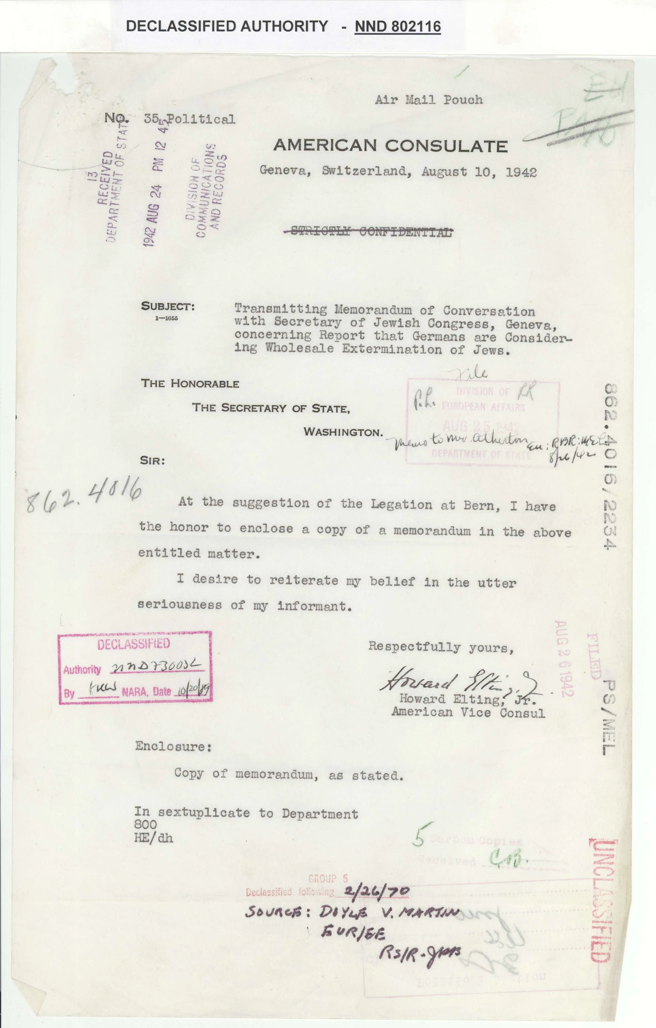 Howard Elting, Jr., finding Riegner’s account credible, relayed the conversation to the American Legation in Bern, Switzerland and eventually to the Secretary of State.