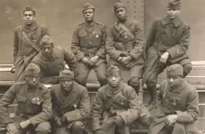 The original caption for this photograph reads: Croix de Guerre winners of the 369th Infantry (Old 15th) , New York Colored regiment, Home on the “Stockholm.” Front row, left to right: Pvts. “Eagle Eye” Ed Williams, “Lamplight” Herbert Taylor, Leon Traitor, “Kid Hawk” Ralph Hawkins. Back row, left to right: Pvt. H.D. Prunes, Sgt. D. Stormes, Pvt. “Kid” Woney, Joe Williams, Arthur Menly, Cpl. Taylor. This regiment was attached to the French Division during the war.