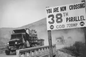 The original caption for this photograph reads: Crossing the 38th parallel. United Nations forces withdraw from Pyongyang, the North Korean capital. They recrossed the 38th parallel.