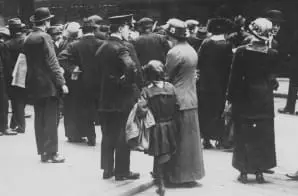 The original caption for this photograph reads; Crowds waiting outside the Cunard Line offices at Liverpool, England, for bulletins about the Lusitania survivors. May, 1915.