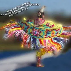 This poster depicts a Native American Dancer from the Cheyenne Dance Troupe from Oklahoma. It was displayed during the observance of Native American Heritage Month by the US Army (USA) 3RD Infantry at Fort Stewart, Georgia.