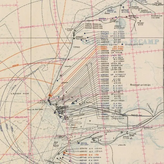 Nearly two months before the invasion of France, this hydrographic chart of the Normandy coast indicates the beach sectors that were chosen for the pending amphibious assault.