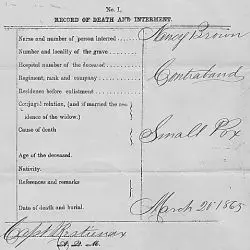 Status: Contraband Death Date: 03/20/1865 This is a part of series of documents that provide the decedent’s name, rank, unit, cause and date of death, and burial location from the Colored Refugee Home and the Freedman’s Hospital for “contraband” slaves who escaped or were brought within Union lines. This document was identified by teachers in our 2015 Primarily Teaching online workshop.