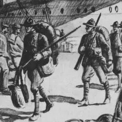 Official American military artist Capt. W.J. Duncan made this drawing. The original caption reads: As many as 30,000 men have landed at this port in one day.