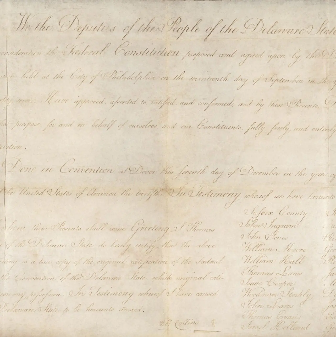 Delaware was the first state to ratify it, on December 7, 1787, by a unanimous vote, 30 – 0. It took 10 months for the first nine states to approve the Constitution. This endorsed ratification of the Constitution by the Delaware convention includes the names of the state deputies, probably written by a clerk. The signature of the President of Delaware’s convention, Thomas Collins, attests to the validity of the document, which also carries the state seal in its left margin.