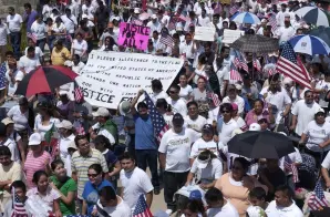 This photograph shows a demonstration to support immigrant rights that was held in Houston, Texas, on April 11, 2006.