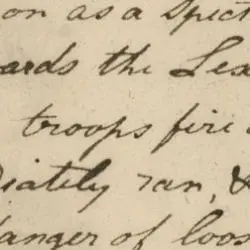 I Timothy Smith of Lexington in the County og Middlesex and Colony [29]of Massachusetts bay in New England being of lawful age, do testify & declare that on the morning of the nineteenth of April instant being at Lexington – common as a spectator I saw a large body of regular troops marching up towards the Lexington- company then dispersing, & likewise saw the regular troops fire on the Lexington company before the latter fired a gun; I immediately ran, & a volley was discharged at me, which put me in imminent danger of loosing my life. I soon returned to the Common, & Saw eight of the Lexington-men who were killed & lay bleeding at a considerabele distance from each other; and several were wounded, I further saith not.