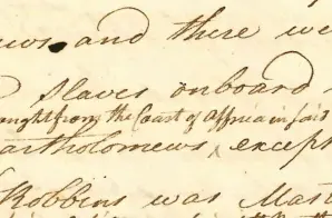 And a french Gentleman by the name Polly, put onboard said Schooner on freight on an agreement with Captain Robbins who was then Captain of her, forty six or forty seven slaves, Randall the rest of the slaves on board were owned by Mrs. Johnson except two or three, as I believe – of of which was a boy belonging to M- Robbins, and one woman belonging to Captain Horn – Mrs. Johnson was in said Schooner on the Coast of Africa when I first knew her and she came out in her to Saint Bartholomews, and from thence to Boston, and Captain Robbins also cam in her to Boston but whether he or Horn was Captain I cannot say with certainty – Mrs Johnson lost on or two slaves on the passage to St Bartholomews, and M. Polly lost one slave. The said Schooner, when on the coast of African was called the Petit Victoire, and when at St. Bartholomews, her name was altered tot eh Charming Sally – The said Schooner Charming Sally was on the Coast of Africa , and Captain Johnson was there in a small Schooner from Philadelphia and he died there, I think it was at Senegal; the Schooner Charming