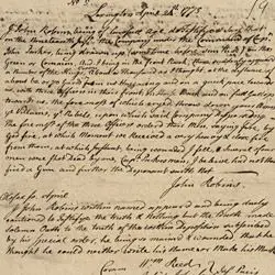 I John Robins being of lawfull age, do Testify & say that on the nineteenth Inst. the Company under the Command of Capn. John Parker, being drawn up, (sometime before sun Rise) on the Green or Common, And, I being in the front Rank, there suddenly appear’d a Number of the Kings ^Troops^, About a Thousand as I thought, at the distance of about 60, or 70 yards from us Hazzaring and on a quick pace toward us, with three officers in their front, on Horse Back and on full Gallop towards us, the foremost of which cryed, throw down your Arms ye Villains, ye Rebels, upon which said Company Dispercing. – The foremost of the three Officers orderd their Men, saying fire, by God fire, at which Moment we Received a very heavy & close fire from them, at which Instant, being wounded I fell, Several of our men were shot Dead by one, Capn. Parkers men, I believe had not then fired a Gun and further the Deponant saith not –