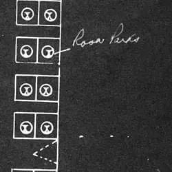 This diagram shows where Rosa Parks was sitting when she refused to give up her seat to a white passenger. It was an exhibit in the Browder v. Gayle court case, which challenged Montgomery and Alabama laws requiring segregated seating on buses. On June 5, 1956, a Federal three-judge panel ruled that such laws violated the 14th Amendment. Later that year, the U.S. Supreme Court upheld the decision.
