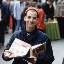 Original caption states: “Fountain Square in Downtown Cincinnati is a Public Square that Works for the City and Its People in a Myriad Of Ways: Distributing Hare Krishna Literature at the Israeli Birthday Celebration.”