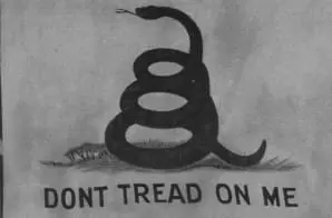 This image is believed to be the first flag of the Marines and of the Continental Navy. The coiled snake was painted on the drums of the early Marines. This is a copy of a flag created in the early 1900s.