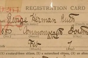 This is the World War I draft card for George Herman Ruth, known as Babe Ruth. It indicates that he worked as a baseball player, employed at Fenway Park in Boston, Massachusetts.