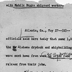 Full Citation: Draft news release relating to the recent disturbances in Mobile at the Alabama Dry Dock and Shipbuilding Corporation; 5/27/1943; Speeches by Members of Regional Office Staff and Other Material, 1943–1945; Records of the War Manpower Commission , Record Group 211; National Archives at Atlanta, Morrow, GA. [Online Version, https://docsteach.org/document/draft-news-release-relating-to-the-recent-disturbances-in-mobile-at-the-alabama-dry-dock-and-shipbuilding-corporation/, December 22, 2025]