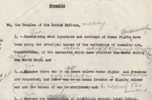 Eleanor Roosevelt’s draft preamble, with its numerous penciled suggestions and edits, reflects her deep involvement in the Declaration’s development; her efforts to engender and promote a lasting, international commitment to universal human rights; and her goal to secure enduring freedoms in a more peaceful world.