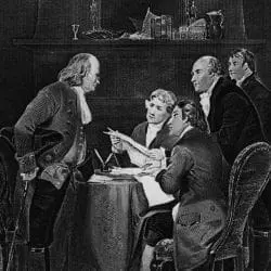 This is a copy of 1857 engraving by Alonzo Chappel. It shows the Committee of Five – Benjamin Franklin, Thomas Jefferson, John Adams, Robert Livingston, and Roger Sherman – drafting the Declaration of Independence during the Second Continental Congress in Philadelphia.