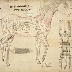 In 1867, William F. Goodwin, of Washington, DC, applied for a patent for an improvement in mechanical toys. His drawing shows a mechanical horse, but in his application he explains that his invention “can be applied to toys made in the image of a variety of animals, either quadruped or biped.”