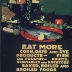 This poster reads: “Eat more corn, oats, and rye products — fish and poultry — fruits, vegetables, and potatoes, baked, broiled, and boiled Foods. Eat less wheat, wheat sugar and fats to save for the Army and our allies.”