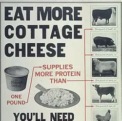 During World War I, the Food Administration under Herbert Hoover promoted “Wheatless Wednesdays” and “Meatless Mondays.” This poster suggests cottage cheese as a protein substitute.