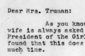 Eleanor Roosevelt served as honorary president of Girl Scouts of the USA from 1933-1945 when she was first lady (it is customary for the first lady to serve as honorary president). She wrote to Mrs. Truman to ask her to do the same, and informed her that she had been asked to serve as honorary vice president.