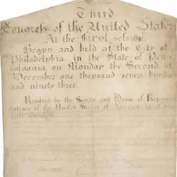 This item is the resolution proposing the Eleventh Amendment which was ratified February 7, 1795, and provides that no state can be sued in federal court by a citizen of another state or a foreign country. A joint resolution is a formal opinion adopted by both houses of the legislative branch. A constitutional amendment must be passed as a joint resolution before it is sent to the states for ratification.