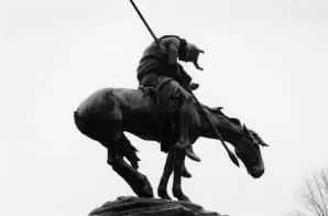 Standing some 15 feet tall, the statue depicts a Native American mounted on a horse. The male figure is depicted in a tattered blanket carrying a spear. Considered to be the first masterpiece of sculptor James Earle Fraser’s long career, it symbolizes the plight of Native Americans at the turn of the 20th century. Originally completed for the San Francisco World Fair in 1915, this cast copy was commissioned by Clarence Addison Shadler to be donated to the Waupun, Wisconsin, where he lived.