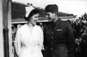This photograph shows American Red Cross nurse, Agnes von Kurowsky, and American Red Cross volunteer, Ernest Hemingway in Milan, Italy.