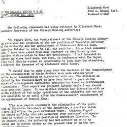 This item is a statement released by Elizabeth Wood, Executive Secretary of the Chicago Housing Authority. It is from the case Dorothy Gautreaux, Odell Jones, Doreatha R. Chrenchaw, Eva Rodgers, James Rodgers, and Robert M. Fairfax v. The Chicago Housing Authority, et al. (Case File 66C1459). This civil case was the first major public housing desegregation lawsuit. It charged that by concentrating more than 10,000 public housing units in isolated African American neighborhoods, the Chicago Housing Authority and the U.S. Department of Housing and Urban Development (HUD) had violated both the U.S. Constitution, which guarantees all citizens equal protection of the laws, and the 1964 Civil Rights Act, which outlaws racial discrimination in programs that receive federal funding. Both the Chicago Housing Authority and HUD were found guilty of discriminatory housing practices.