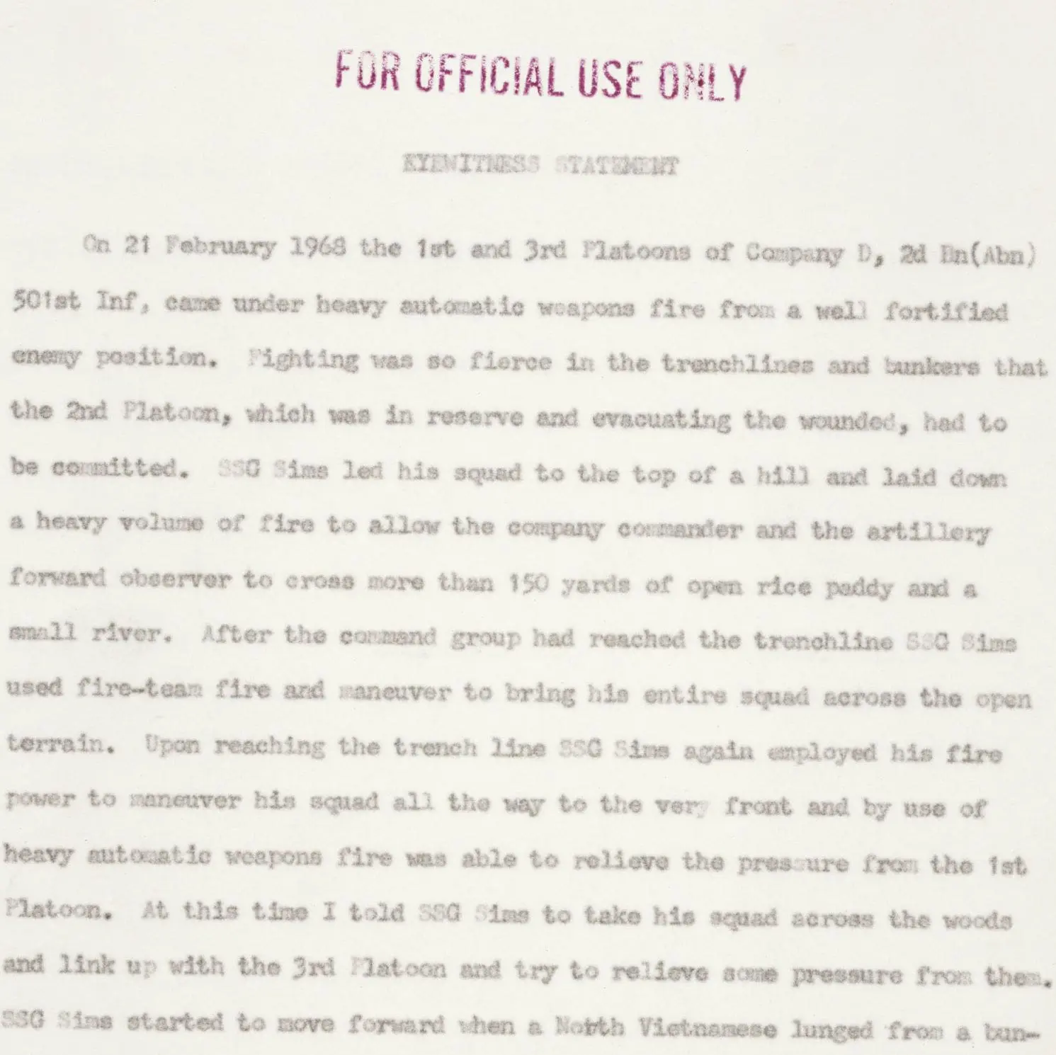 As a result of this and other statements, Staff Sergeant Sims was awarded posthumously the Congressional Medal of Honor. In an extraordinary occurrence, SSG Joe Hooper of the same company earned the Congressional Medal of Honor on the same day.
