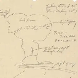 This is a typewritten account of the detonation of the Trinity atomic device, written by physicist Luis W. Alvarez, who witnessed it from a B-29 aircraft flying 24,000 feet over the site. In this report, Alvarez comments upon the detonation itself, the formation of the mushroom cloud, and the observations of the shock wave by the pilot and other passengers in the aircraft. Included are two sketches Alvarez made of the developing mushroom cloud, with notations.