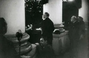 This photograph shows President Franklin D. Roosevelt and Prime Minister Winston Churchill on the South Portico of the White House during the National Christmas Tree Lighting ceremony.