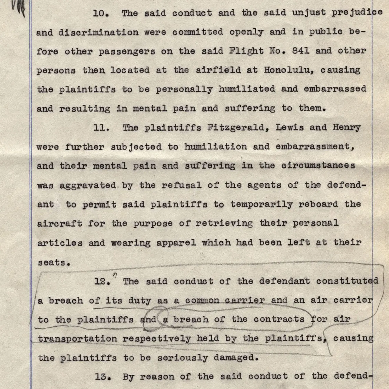 Jazz singer Ella Fitzgerald, an international singing sensation, faced discrimination when on tour. En route to a concert from Honolulu to Australia, she was denied the right to board a Pan American flight because she was African American. She filed this complaint, along with John Lewis, Georgiana Henry, and Norman Granz, against Pan American World Airways, Inc.