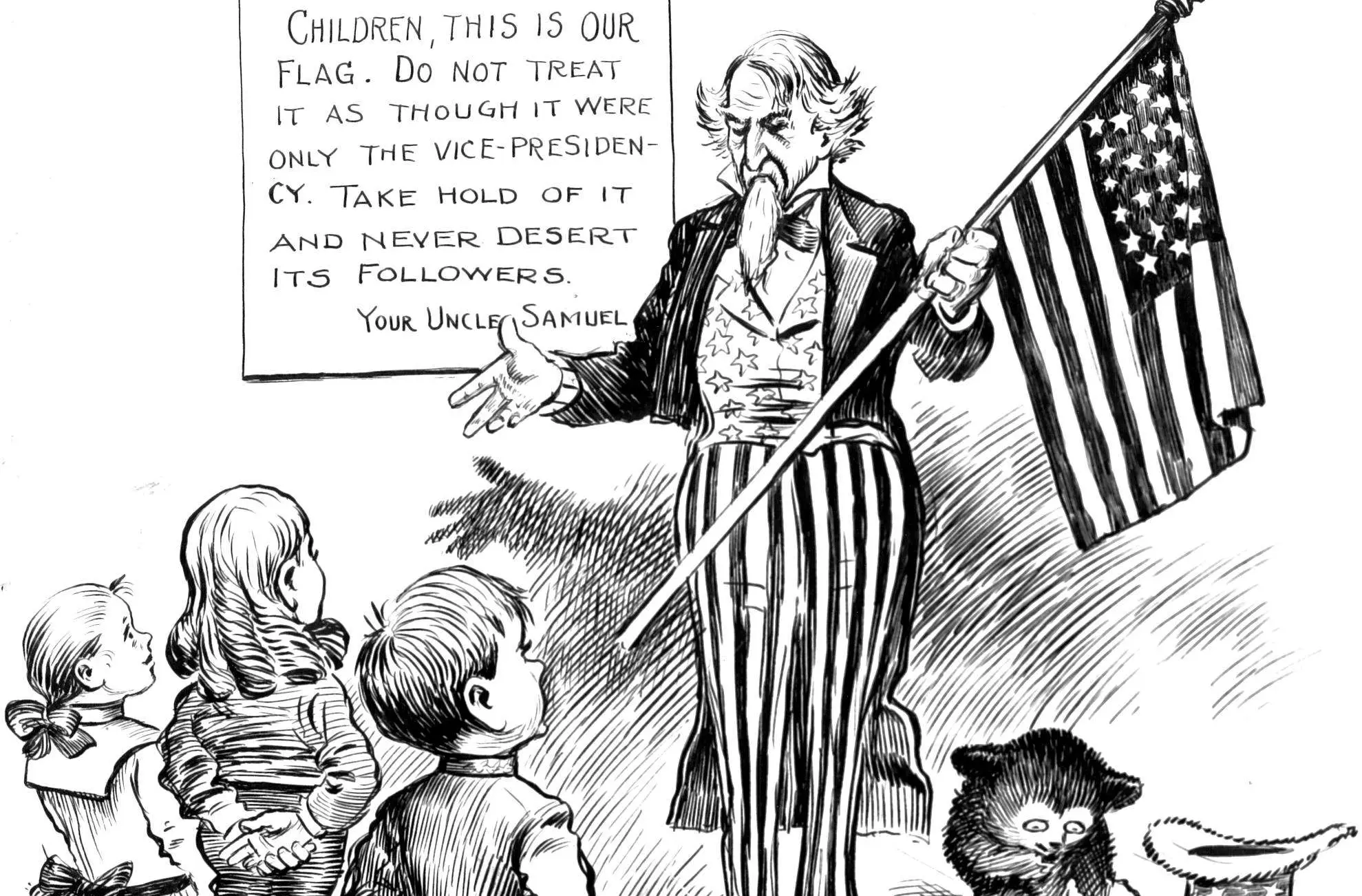 This illustration by cartoonist Clifford Berryman appeared in the Washington Post on Flag Day, 1904. It shows Uncle Sam instructing schoolchildren that the American flag, unlike the office of the Vice President – which he ridicules in a kindly manner – is to be held dear to their hearts. With the 1904 Presidential nominating conventions about to begin, it’s a clear reference to Berryman’s low regard for the office of Vice President. Berryman’s teddy bear takes a bow as he stands beside Uncle Sam.