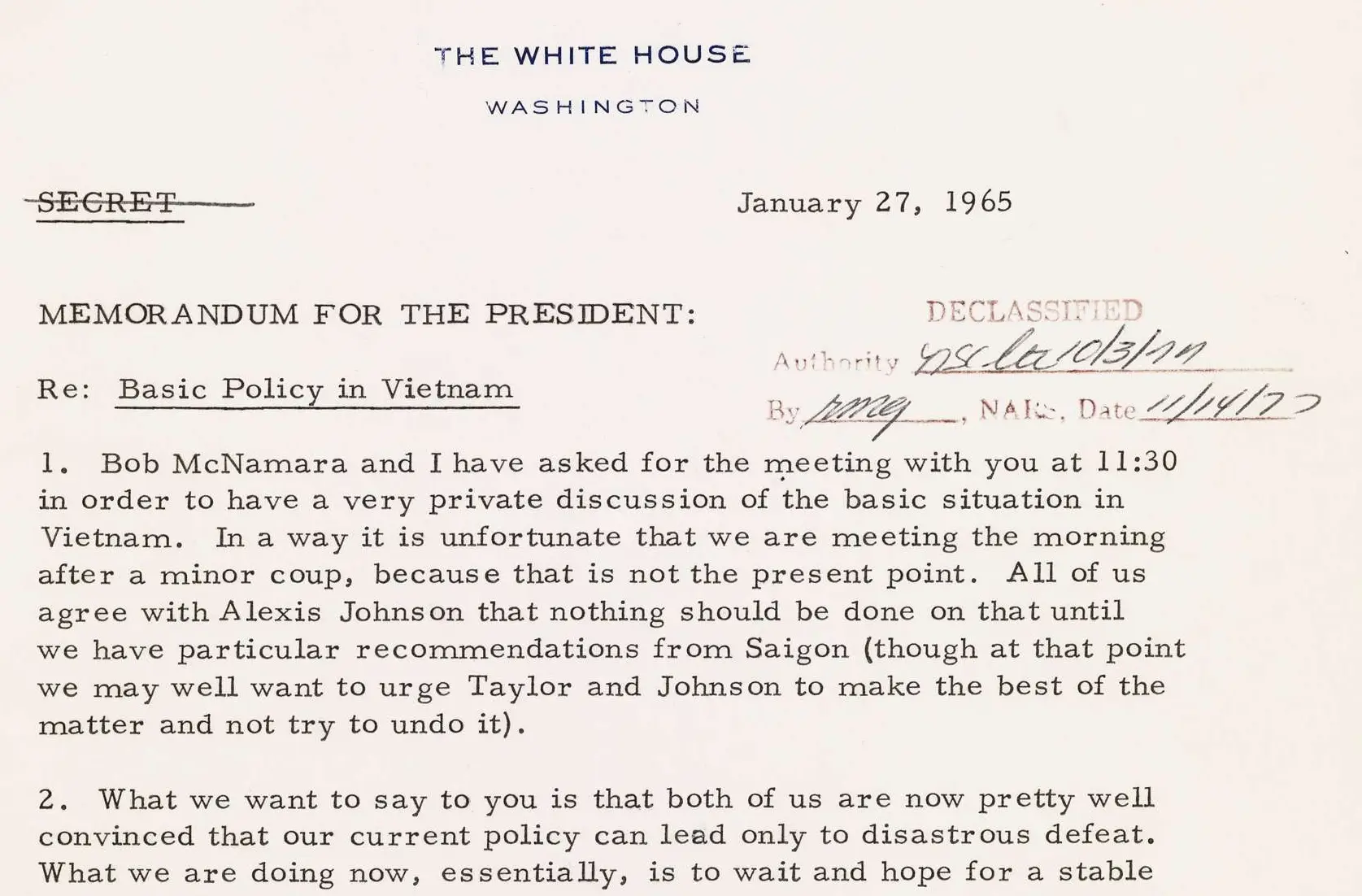 Assistant National Security Adviser McGeorge Bundy and Secretary of Defense Robert McNamara told newly elected President Johnson that their current course in Vietnam could not succeed. They presented two alternatives: bring in the full force of the U.S. military or negotiate with the enemy. They knew Johnson would never consider the second but recommended both options be debated. Within a year, 175,000 American troops were in Vietnam. Negotiation was never discussed.