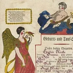 Christian Nichols served six months as a private in Col. John Keller’s regiment of the Bucks County (PA) Militia during the Revolutionary War. In 1820 P. Atta completed this fill-in-the-blank German-language illustrated family record (Fraktur) recording the birth and baptismal of Christian’s son Daniel. It was printed by Johann Ritter of Reading, Pennsylvania.