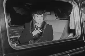 This photograph shows Secretary of Labor Frances Perkins in an automobile, apparently at the White House shortly after President Roosevelt’s death.