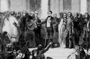 Assembling of the Multitude at the Eastern Portico at the Commencement of the Inauguration Ceremonies, from Frank Leslie’s Illustrated Newspaper, 1853. Franklin Pierce Inauguration.