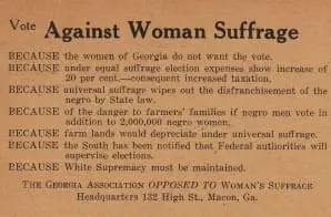 We want you to know that the Georgia women and the majority of our southern women are opposed to woman suffrage and hope your committee will vote against the Federal amendment. We are sure our southern men grant us all the privileges and rights we should have and do not want to add 2 million negro women to the electorate and as the Hon. Charles Cooper of Jacksonville, former Congressman and Attorney-General, said to me, “If the negro women vote, they will see to it the negro men vote.” We have many good reasons for our opposition