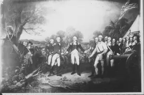 This is a copy of John Trumbull’s oil painting “Surrender of General Burgoyne” depicting the surrender of British General John Burgoyne at Saratoga, New York. Trumbull’s original painting is on display in the Rotunda of the U.S. Capitol.
