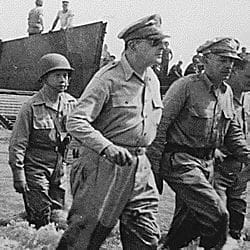 Full Citation: General Douglas MacArthur wades ashore during initial landings at Leyte, Philippine Islands; 10/1944; Records of the Office of the Chief Signal Officer, Record Group 111. [Online Version, https://docsteach.org/document/general-douglas-macarthur-wades-ashore-during-initial-landings-at-leyte-philippine-islands/, January 13, 2026]