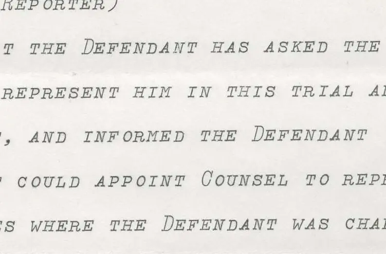 In 1961, Clarence Earl Gideon was charged with breaking and entering the Bay Harbor Pool Room in Florida with an intent to commit a misdemeanor. Gideon, a fifty-year-old man with an eighth-grade education and prior criminal history, could not afford a lawyer for the trial. He pleaded not guilty and requested a court-appointed lawyer. The judge refused because Florida only provided free lawyers in capital cases. This document, an excerpt from the court reporter’s transcript of that trial, shows Gideon’s request for counsel and the judge’s denial.