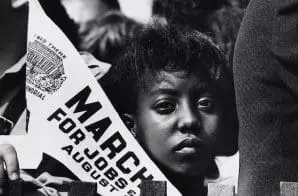 The girl in the photograph is Edith Lee-Payne of Detroit, Michigan, who celebrated her 12th birthday by attending the March on Washington with her mother. In the photograph she carries a March on Washington banner and concentrates intently on the scene before her.