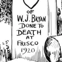 In this image, cartoonist Clifford Berryman shows a mourning Bryan, top hat in hand and a “dry plank” under his arm, at a tombstone inscribed “the love of W. J. Bryan done to death at Frisco 1920.”
