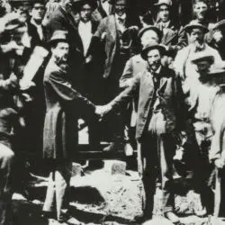 The Transcontinental Railroad was completed on May 10, 1869, when four ceremonial gold and silver spikes were driven into a laurel wood railroad tie at Promontory Summit, northwest of Salt Lake City, Utah. This act joined 1,776 miles of rail belonging to the Union and Central Pacific railroads. The Union Pacific’s engine, 119, is on the left; the Central Pacific’s Jupiter is on the right. The ceremonial spikes and tie were removed and replaced with iron and pine.
