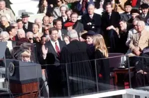 This Inauguration Day photograph shows former Senator Albert Gore Jr. of Tennessee being sworn in as Vice President of the United States as his wife, Tipper, and their children look on. President-elect Bill Clinton is seated.